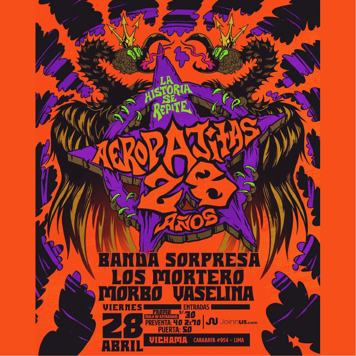 Aeropajitas celebra su 28 aniversario con un concierto junto a Los Mortero , Morbo , Vaselina y más. El concierto se realizará este 28 de abril en Vichama.