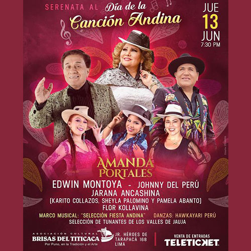 La destacada folclorista Amanda Portales se prepara para celebrar el Día de la Canción Andina en una gran fiesta que se realizará, el próximo jueves 13 de junio, en la Asociación Cultural Brisas del Titicaca. Bajo el título de “Serenata al Día de la Canción Andina”, el concierto contará con grandes artistas invitados y será un sentido homenaje a la música de nuestra serranía y un adelanto de los festejos por el Día del Padre.