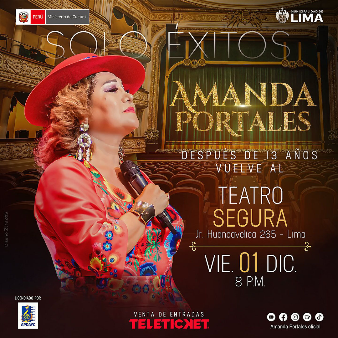 Después de 13 años, Amanda Portales, la folclorista más reconocida de nuestro país, regresará al Teatro Principal Manuel A. Segura para presentar lo mejor de su arte. En este bello, tradicional, histórico y renovado recinto, la Excelencia Artística presentará el espectáculo titulado “Sólo éxitos”, un pedido especial de su público, recogido por la artista en cada uno de los lugares donde se presenta.