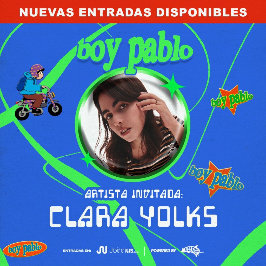 Veltrac también anunció que Clara Yolks será la artista que abrirá el show de Boy Pablo en Lima. En los primeros meses del año volvió con una canción muy personal, ‘Emocional’, la cual marcó su regreso después de cuatro años de no tener mucha actividad.