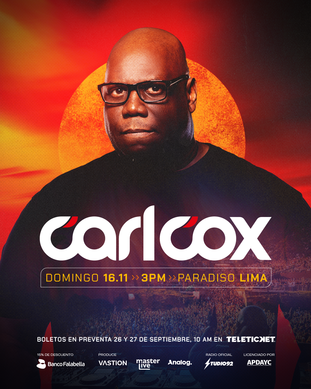 Carl Cox – Sunset Open Air, un espectáculo único que se realizará el domingo 16 de noviembre en el Paradiso – Club Cultural Deportivo Lima (Chorrillos). La capital recibirá a uno de los artistas más influyentes y respetados de la escena, un referente que ha llevado la música electrónica desde los clubes underground del Reino Unido hasta los escenarios más emblemáticos del planeta.