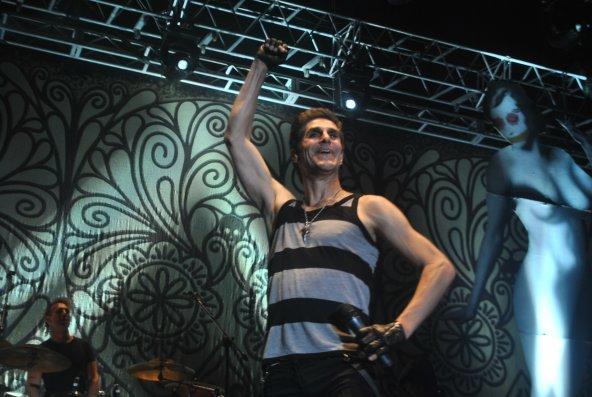 9.31pm Un potente bajo anunciaba el inicio del concierto con Whores. El telón negro calló sobre el piso y destapó a toda la banda que arrancaba con todo acompañada de dos bailarinas que colgaban en el techo desde piercings en sus abdómenes. La actitud de Perry Farrell y toda la banda era sorprendente, no importaba que solo estuvieran los más fanáticos ahí. Jane’s Addiction estaba dispuesto a hacerles el concierto tal como lo habían soñado.
