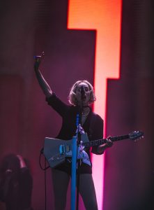 St. Vincent aperturó la noche estelar deleitando al público con canciones de funk, rhythm & blues, sonidos ácidos y de glam, que hicieron vibrar el escenario Santander. Tuvo un momento romántico con sus fanáticos, brindando y expresando su amor por Barcelona.