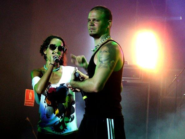 Luego toca el turno de un poco de rap con “La fokin moda” para luego invitar a unas cuantas voluntarias del público a que se suban a bailar al ritmo de “Se vale todo”. Entre las emocionadas fanáticas que se treparon al escenario vimos a la tímida Wendy Sulca, la conocida cantante folclórica quien, para desgracia de muchos que sueñan con vivir en Miami y se averguenzan de sus raices, es del agrado de la Calle 13. Para envidia de las fanáticas, Residente bailaba con la pequeña Wendy al ritmo de la irreverente canción. Acabada el tema y se bajaron las fans enamoradas.