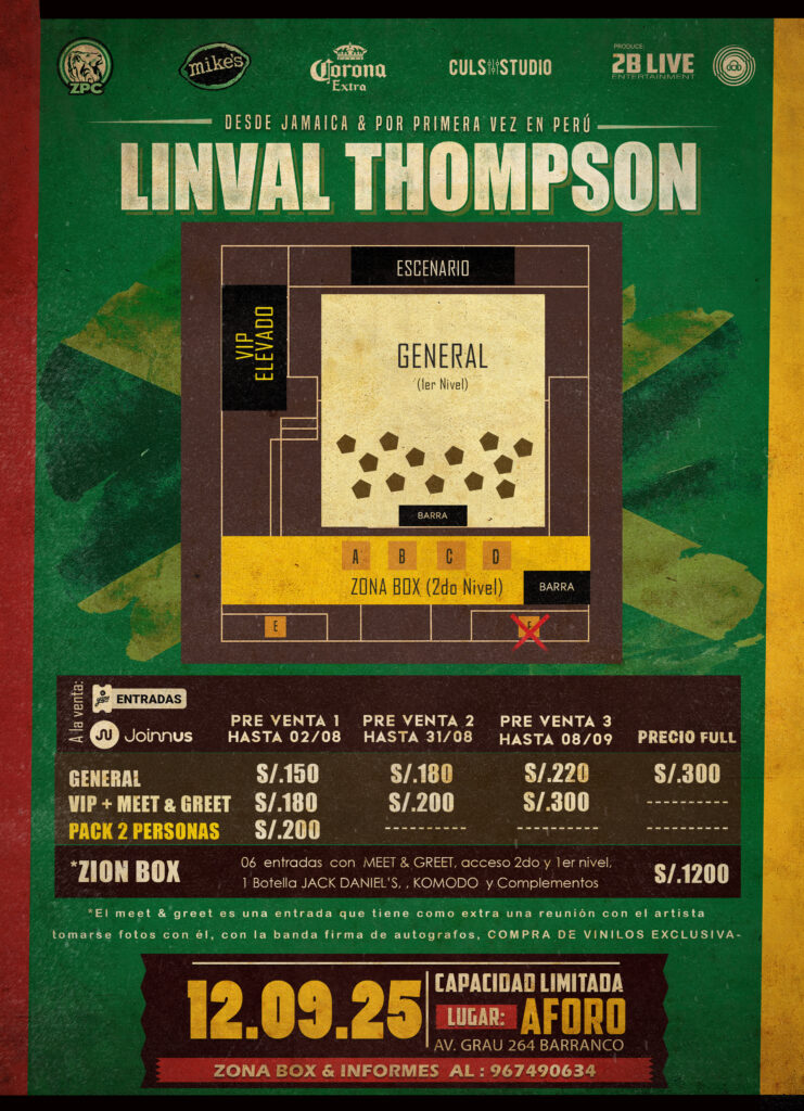 DESDE JAMAICA LINVAL THOMPSON EN PERÚ – REGGAE GOLD Este viernes 12 de septiembre, Lima se ilumina con una cita imprescindible: la llegada por primera vez a la ciudad de Linval Thompson, uno de los grandes del roots-reggae y dub, cuya música define una época y trasciende generaciones. Linval Thompson no llega a Lima solo a cantar; llega a compartir historia y lujo musical en cada nota, en cada dub y en cada emocional verso. Este 12 de septiembre en el centro cultural AFORO de Barranco, promete sorprender tanto a amantes del reggae clásico como a quienes lo descubran por primera vez., en un viaje por décadas de raíces reggae y dub, con versiones originales y dubs de clásicos como Cool Down o Jah Jah Is the Conqueror. Vivirás mucho más que un show: será una experiencia cultural y sonora de alto nivel. Los esperamos con los brazos abiertos para celebrar juntos la cultura reggae de su era dorada, y así seguir trayendo al Perú a las figuras más icónicas de un género que tanto amamos y respetamos.