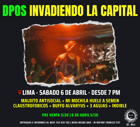 DPOS, la banda de Ica vuelve a Lima para una noche de pogo entre amigos, este sábado 6 de abril desde las 7:00 p.m. Les acompañan Mi mochila huele a semen, Maldito antisocial, Claustrofóbicos, Buffo Alvaryus, 3 agujas e Inoible.