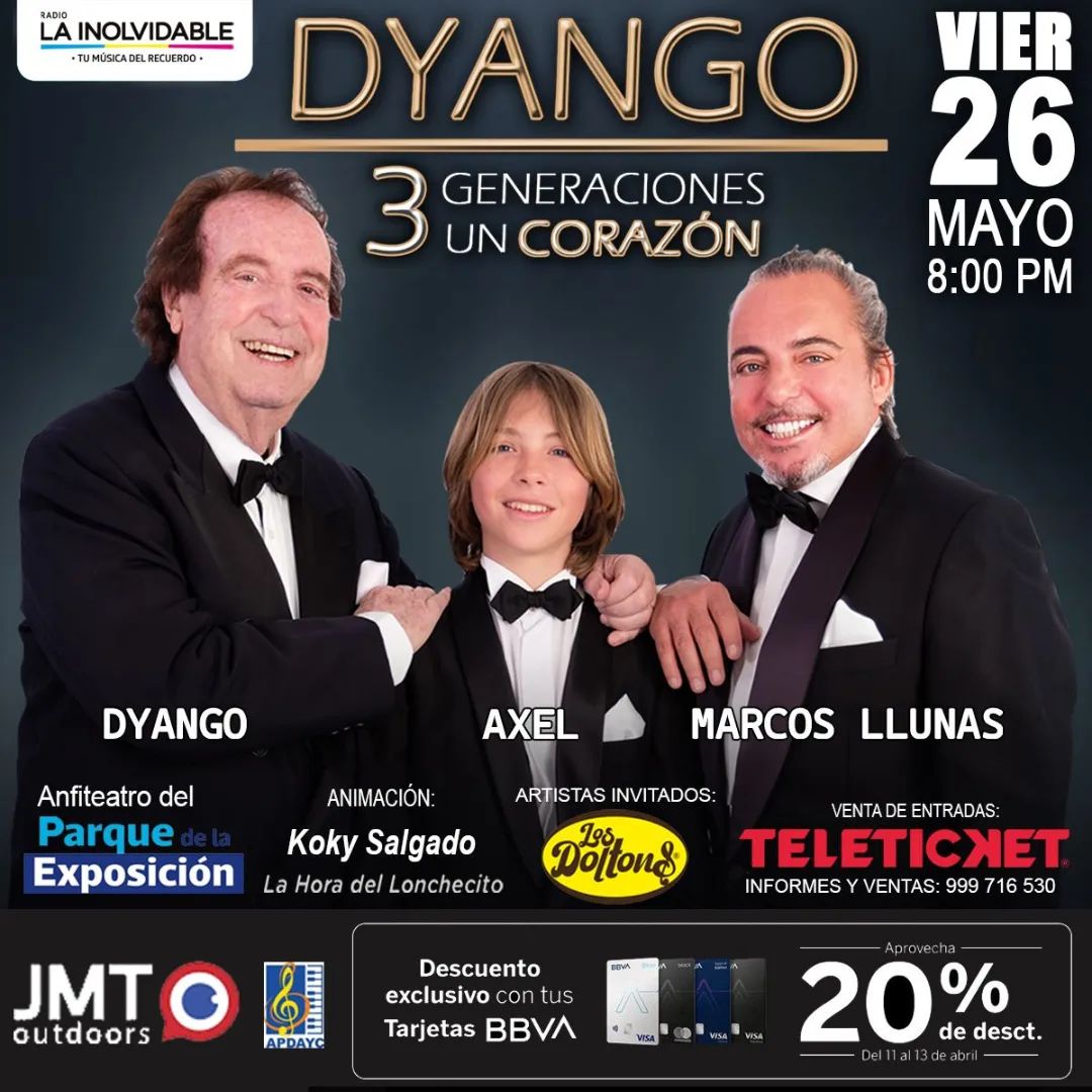 Por primera vez juntos Dyango, Marcos Llunas y Axel (Abuelo, padre y nieto) en concierto en Lima este 26 de mayo en el Anfiteatro del Parque de la Exposición.