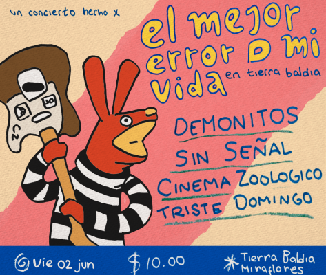 Jóvenes y visionarias bandas de rock independiente, se reúnen para traer «El mejor error de mi vida», una noche de música fresca y emocionante. Una gran oportunidad para escuchar a qué suena el futuro del rock independiente en Lima. Estarán Demonitos, Sin Señal, Cinema Zoológico, DPOS y Triste Domingo.