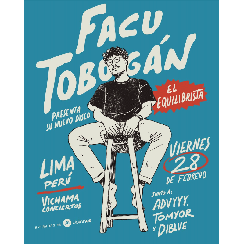 Facu Tobogán vuelve a Lima para presentar su nuevo disco:»El Equilibrista» entre todo su repertorio solista y temas de Tobogán Andaluz este 28 de febrero en Vichama Conciertos. Acompañan: Advyyyy, Tomyor y Diblue.
