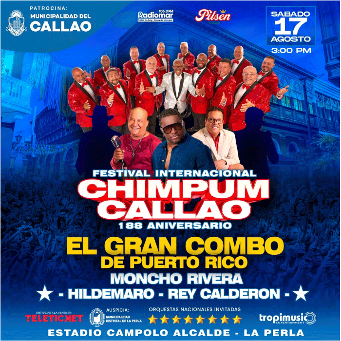El Gran Combo de Puerto Rico, Rey Calderón, Moncho Rivera, e Hildemaro llegan para celebrar el 188 aniversario de fundación de El Callao este 17 de agosto en el Estadio Campolo Alcalde.