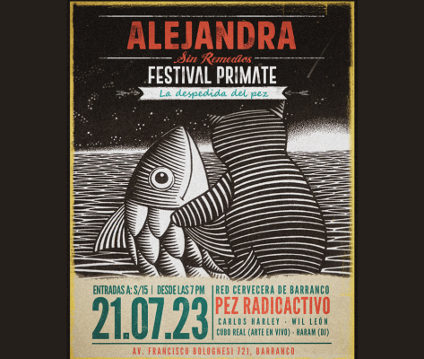 Alejandra Sin Remedios vuelve al Festival Primate y esta vez la cita es para despedir al Pez Radioactivo en su último concierto. Con un Line Up que también incluye la participación de Wil León, Carlos Harley, Haram (DJ) y Cubo Real; será un viernes lleno de sorpresas, muy buena vibra y mucho arte.