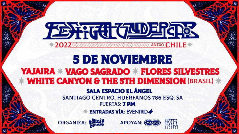 El sábado 5 de noviembre se llevará a cabo la primera edición del Festival Undercaos, en Chile, en Espacio Sala El Ángel desde las 7 p. m. En este primer abordaje a la escena psicodélica del país del sur, la fecha funciona como concierto anexo y contará con la participación de 3 bandas chilenas y 1 brasileña:
