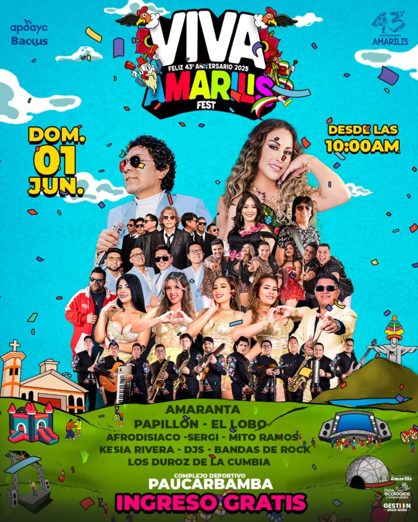 El distrito de Amarilis, ubicado en el departamento de Huánuco, celebra este domingo 1 de junio su aniversario número 43. Al ser una fecha tan importante, se realizará un festival gratuito y pensado en toda la familia en donde se reunirán grandes exponentes de la música nacional.