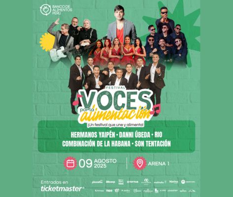 El Banco de Alimentos del Perú presenta el próximo sábado 9 de agosto, el Festival Voces por la Alimentación, un evento donde cada entrada se convierte en una ración de alimentos para las personas en estado de vulnerabilidad. El cartel reúne a Hermanos Yaipén, Danni Úbeda, Río, Combinación de La Habana, Son Tentación y artistas sorpresas.