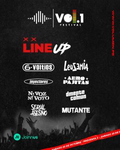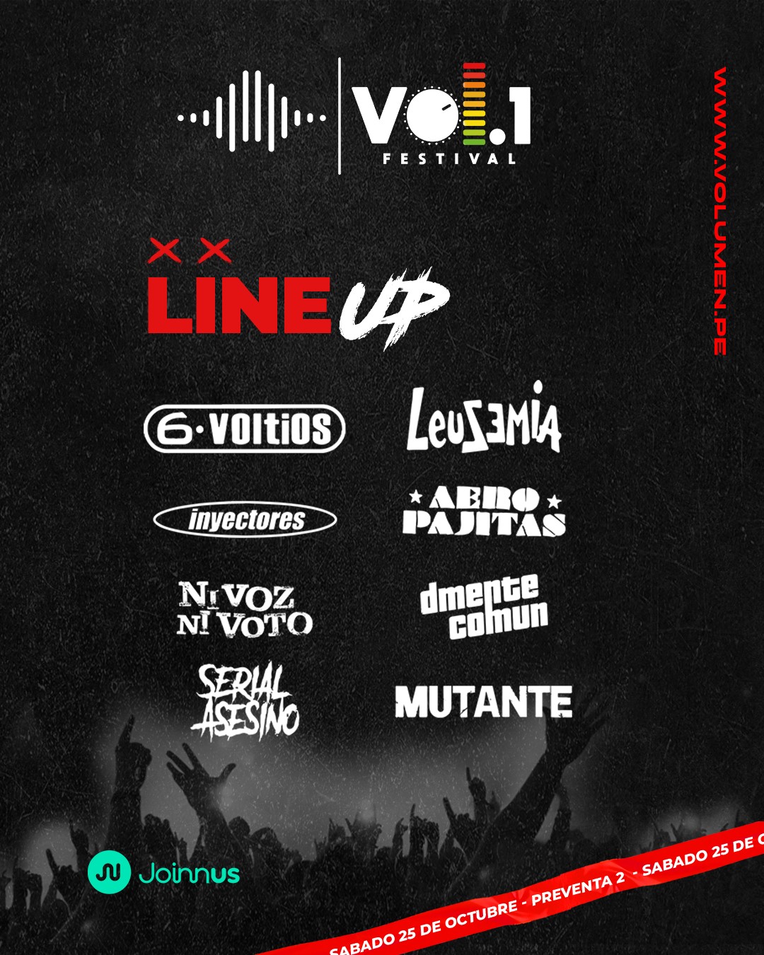 Las legendarias bandas reunidas en el Festival Volumen 1 han contribuido a la escena musical peruana durante más de treinta años. Letras poderosas, riffs inconfundibles y actuaciones llenas de energía han dejado una huella imborrable en la cultura musical del Perú. Hablamos de 6 Voltios, Leuzemia, Inyectores, Dmente Común, Ni Voz Ni Voto, Serial Asesino, Mutante y Aeropajitas, que se darán cita este sábado 25 de noviembre en el Centro de Convenciones Festiva: Av. Alfonso Ugarte 1439, Lima.