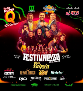 El FESTIVALAZO anuncia su nueva edición con un cartel imperdible que ofrece las mejores propuestas musicales de la ciudad para armar una gran fiesta, los Hermanos Yaipén, Deyvis Orosco, Tony Rosado, Libido, Río, Zaperoko y los DJ’S Peligro y Linda serán parte de este concierto que se dará el viernes 07 de octubre en el icónico local El Huaralino de Lima Norte.