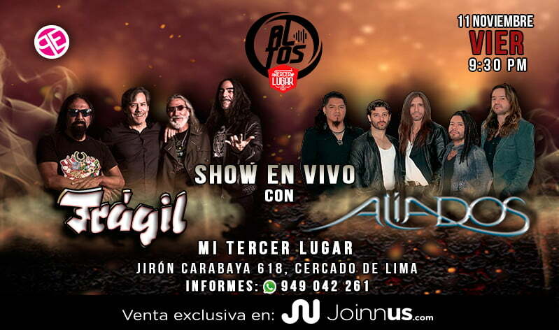 Mi Tercer Lugar del Centro de Lima presenta a dos de la bandas mas representativas del rock nacional FRÁGIL + ALIADOS, en una noche cargada del mejor rock, con una banda emblemática y de gran trayectoria musical como lo es Frágil y con 20 años en escena rompiéndola con su rock melódico, se suma la banda ALIADOS, son su líder Pepe Gonzales.