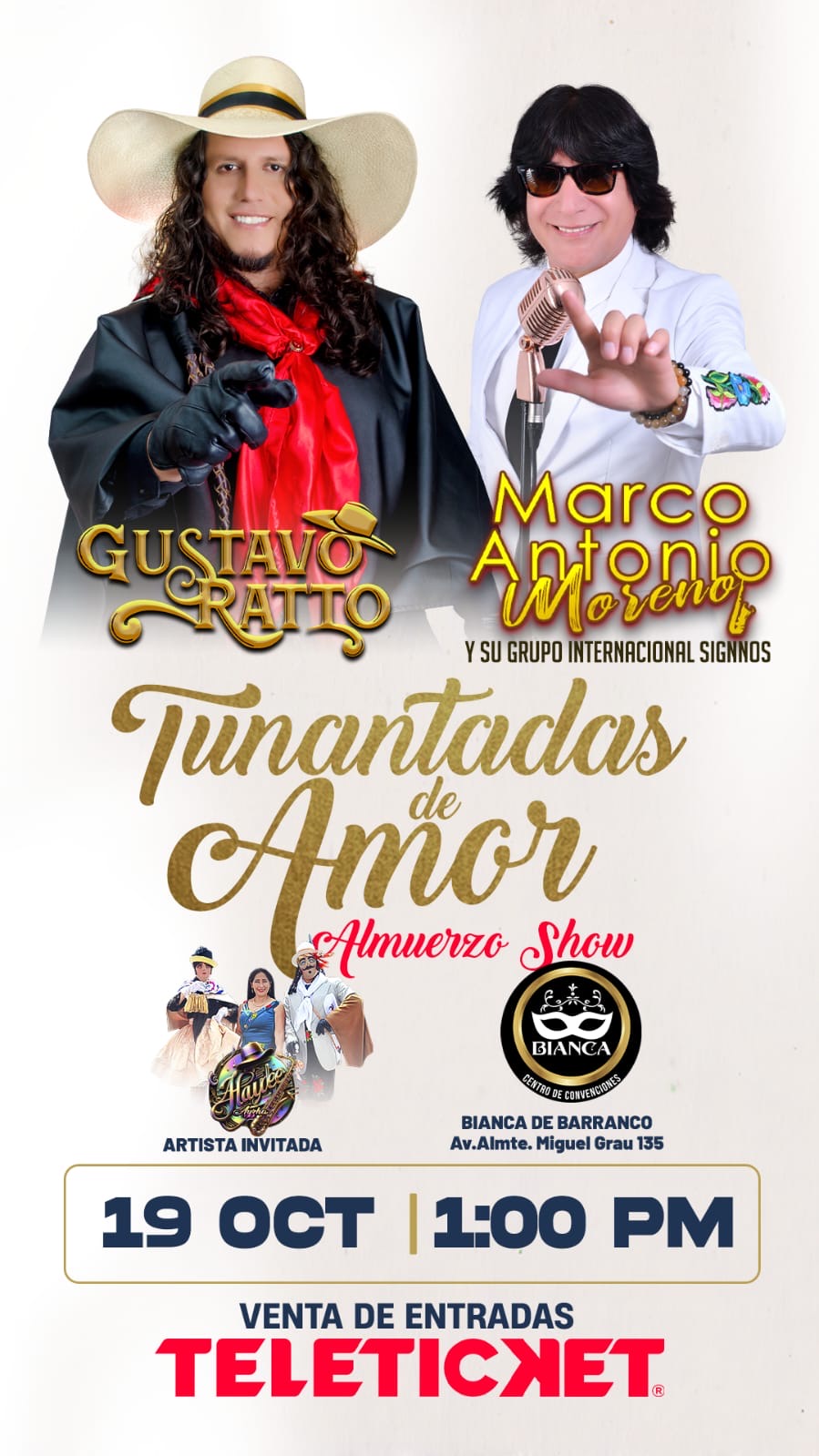 El reconocido cantautor peruano Gustavo Ratto, conocido internacionalmente como “El Arriero de la Tunantada”, regresa a Lima con un espectáculo único: “Tunantadas de Amor Vol. 4”, que se realizará el sábado 19 de octubre en el Bianca de Barranco desde la 1:00 p.m.