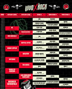 El festival Vivo X el Rock ha revelado en sus redes sociales los horarios oficiales de su próxima edición, que se llevará a cabo en Lurín Live con un cartel estelar que reúne a grandes exponentes del rock, punk y metal. La jornada arrancará desde la 1:00 p. m. con presentaciones simultáneas en cinco escenarios y culminará a la 1:30 a. m. con Avenged Sevenfold en el escenario principal. Aún hay entradas a la venta en Ticketmaster.