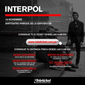 La famosa banda estadounidense INTERPOL llega a Lima ofreciendo un concierto especial único en la región. El show coincide con el lanzamiento de su nuevo disco “The Other Side of Make-Believe” y será un repaso de su carrera que este año cumple más de 20 años de grandes momentos musicales. La cita será el 16 de noviembre en el Anfiteatro del Parque de la Exposición. Las entradas ya están disponibles a precio regular vía Teleticket con 25% de descuento con tarjetas Interbank y para este show se han habilitado los siguientes módulos presenciales de venta: Wong de San Borja, San Miguel y Chacarilla, Metro de Plaza Norte y el C.C. Bajada Balta de Miraflores.