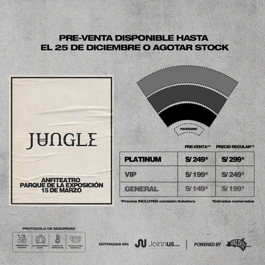Las entradas para ver a Jungle y poder sentir toda la adrenalina que ofrecen ya están disponibles en la plataforma de Joinnus.com desde 145 soles. La preventa exclusiva será hasta 25 de diciembre o hasta agotar stock.