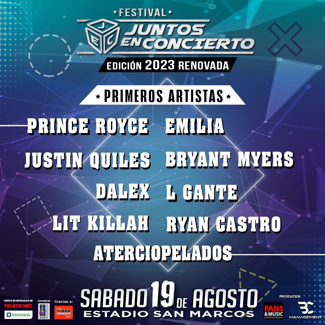 El Festival Juntos en Concierto vuelve este 19 de Agosto, para una nueva edición con presentaciones de: Prince Royce, Emilia, Justin Quiles, Bryant Myers, Dalex, L Gante, Lit Killah, Ryan Castro y Aterciopelados.