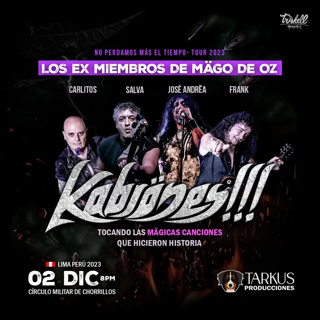 Los auténticos y más queridos ex miembros de la legendaria banda española Mägo de Oz: Jose Andrëa, Frank, Carlitos y Salva, llegan a Lima bajo el nombre de KABRÖNES, para traernos temas de LA MEJOR época de Mägo de Oz. La banda la completan los miembros de la increíble banda española RUNA LLENA: Joaquín Arellano “El Niño” en la batería, Santiago Vokram con su violín y Edu Ortiz en los teclados. Además, contarán con dos grandes bandas invitadas: Flor de Loto y La Sarita.