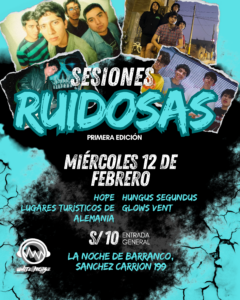 El concierto Sesiones Ruidosas se llevará a cabo el próximo 12 de febrero en La Noche de Barranco, ubicada en Sánchez Carrión 199. Las entradas tienen un costo de 10 soles y pueden adquirirse a través de Yape al 952885923 o enviando un mensaje directo a la cuenta de Instagram @whitenoisehead. Será una noche imperdible, donde la diversidad musical y el espíritu urbano se encontrarán en el escenario.