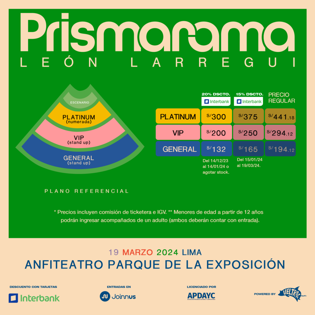 Lo que más llama la atención de este nuevo disco es la intensa belleza de sus melodías; la poesía de todos sus momentos.Prismaramaes como una lluvia de estrellas. Y el concierto de este xx de marzo será una oportunidad para apreciar los temas de esta propuesta y para repasar canciones de otros trabajos como ‘Brillas’, ‘Locos’, ‘Como Tú’, ‘Amantes’ y más. Veltrac Music, productora del evento informó que las entradas están disponibles desde el jueves 14 de diciembre en la plataforma de Joinnus, desde las 9 am. Existe un 20% de descuento con tarjetas Interbank. Menores de edad a partir de 12 años podrán asistir acompañados de un adulto responsable.