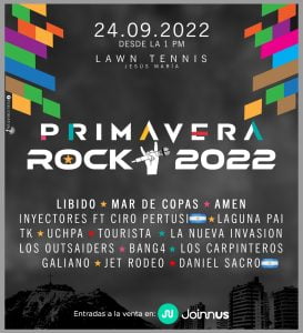 El festival PRIMAVERA ROCK reunirá a Libido, Amen y Mar de Copas, las tres principales bandas de nuestro país, luego de varios años de no coincidir en un mismo evento, el sábado 24 de setiembre en el Club Lawn Tennis de Jesús María, donde ofrecerán shows extensos con todos sus éxitos, junto a un variado cartel nacional y la presentación del argentino Ciro Pertusi, ex vocalista de Attaque 77, como estrella internacional. Las entradas están a la venta en Joinnus desde 60 soles.