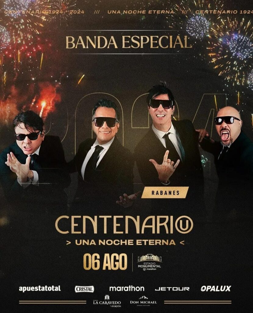 Los Rabanes, la influyente banda de rock panameña celebrará los cien años de Universitario junto a Gian Marco, Auténticos Decadentes, Bacanos, Marisol y Ana Carina Copello encargados de poner música y baile en «La Noche Eterna» el próximo 6 de agosto en el estadio Monumental.