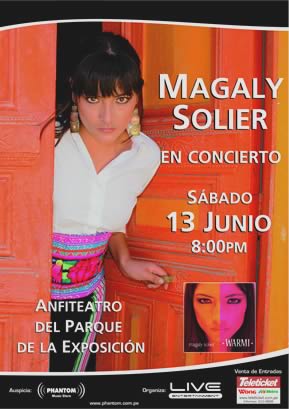 Luego de una exitosa temporada en el Cocodrilo Verde, Magaly Solier se estará presentando lo mejor de su repertorio, incluyendo temas de su exitoso disco Warmi, el sábado 13 de junio en el Anfiteatro del Parque de la Exposición a partir de las 8 de la noche.