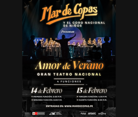 Mar de Copas se presentará junto al Coro Nacional de Niños en el Gran Teatro Nacional el 14 y 15 de febrero con 4 funciones en un concierto titulado Amor de Verano. Las entradas están a la venta en mardecopas.pe