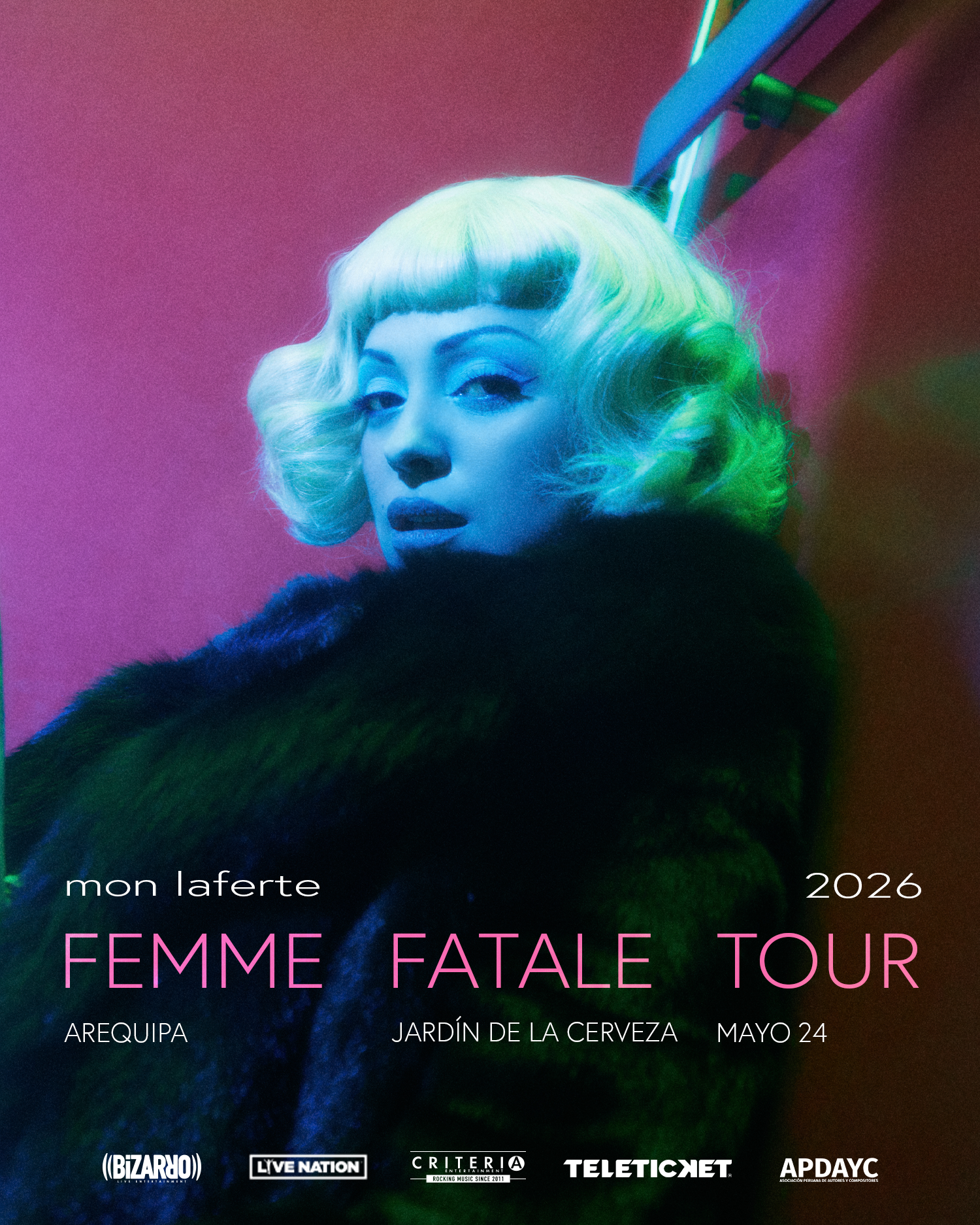 Luego de lograr un rotundo sold out en Lima, la cantante y compositora chilena Mon Laferte anuncia una nueva fecha en el Perú. La artista se presentará en Arequipa, en el emblemático Jardín de la Cerveza, como parte de su esperada gira internacional “Femme Fatale”. Las entradas estarán disponibles desde el miércoles 11 de marzo a las 10:00 am a través de Teleticket.