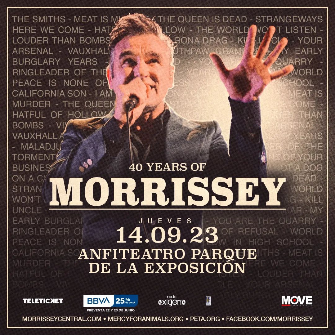 Morrissey vuelve a Lima para celebrar sus 40 años de trayectoria, con su gira «40 years of Morrissey”, en donde repasará los más grandes éxitos de su carrera como solista, así como los éxitos de The Smiths. El concierto se realizará este 14 de setiembre en el Anfiteatro del Parque de la Exposición.