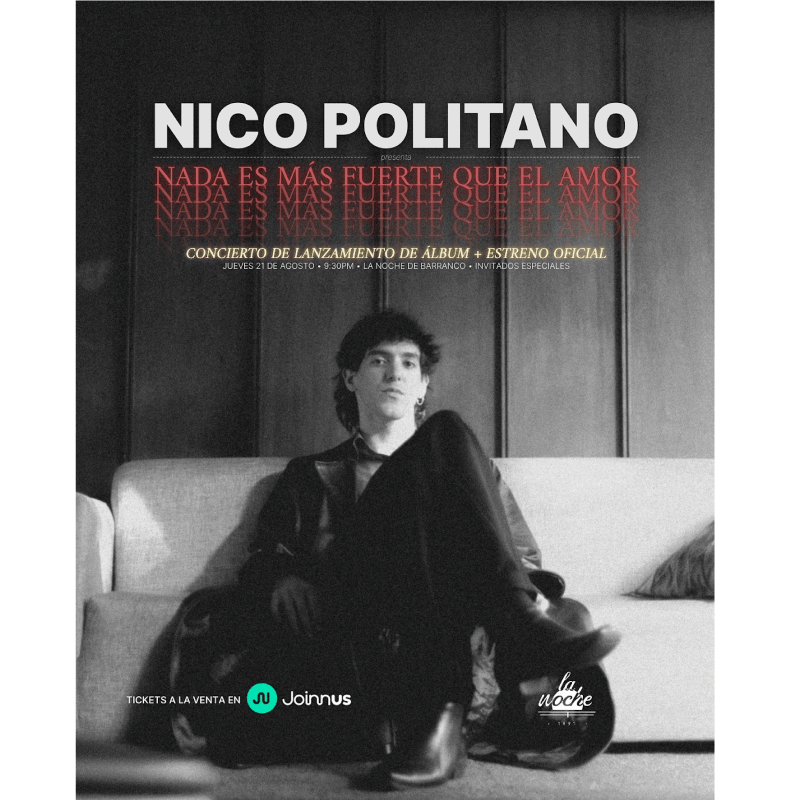 El jueves 21 de agosto, Nico Politano presenta en vivo en La Noche de Barranco, su primer disco: Nada Es Más Fuerte Que El Amor. Un show íntimo y potente para vivir las canciones como fueron pensadas: en escena y con la gente cerca.