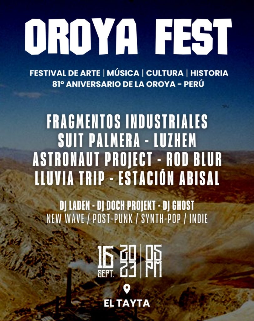 Este año, el Oroya Fest se realizará el sábado 16 de septiembre en el local El Tayta, un festival que promueve el arte y la cultura de La Oroya. El cartel está conformado por siete bandas que representan lo mejor del indie peruano: Fragmentos Industriales, Suit Palmera, Luzhem, Lluvia Trip, Rod Blur, Astronaut Project y Estación Abisal. Además, habrá DJ sets de Laden, Doch Projekt y Ghost, que pondrán a bailar al público con sus mezclas de new wave, synth-pop, post-punk e indie.