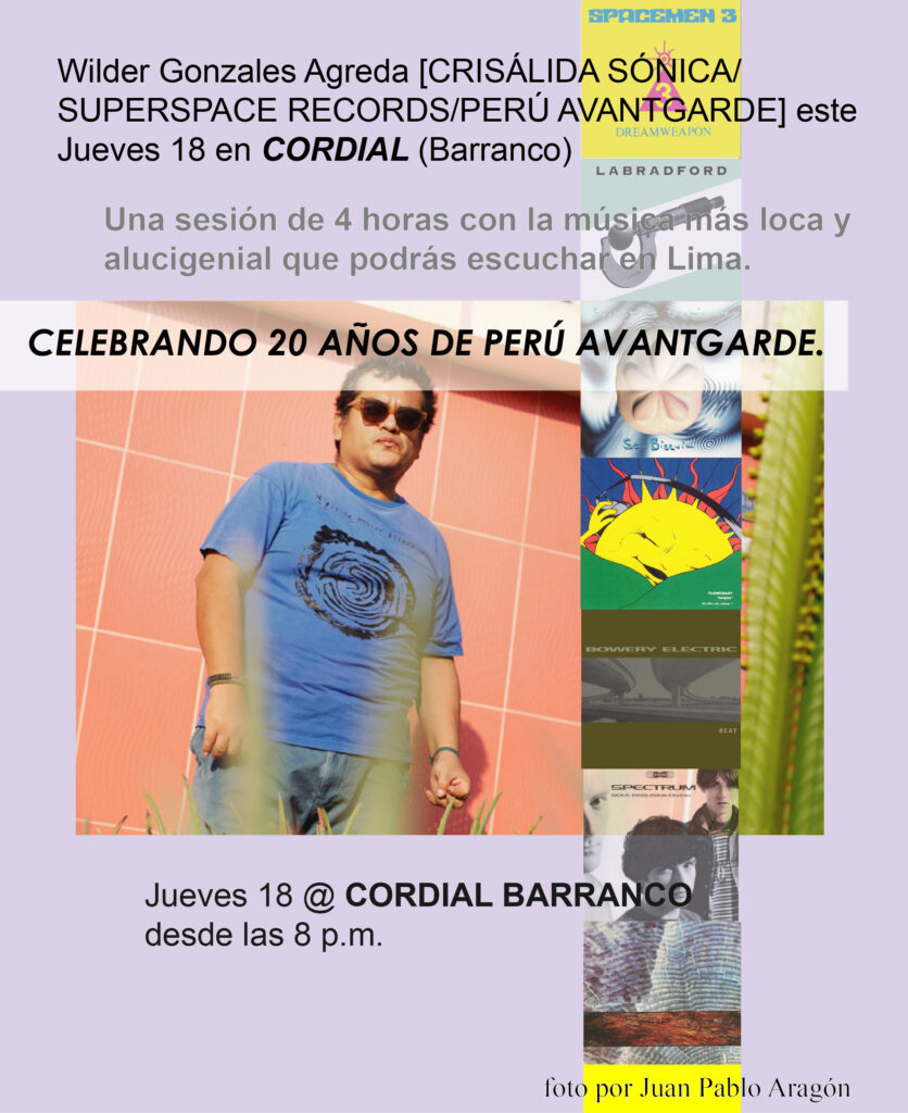 Perú Avantgarde es un blog de activismo contracultural y música experimental (shoegaze, post rock, ambient, kraut, neo psych, ruido, etc) fundado el 16 de Julio de 2004 el cual esta semana cumple 20 años de desmesurada labor en pro de la avanzada peruana y mundial. Por esta bitácora ha pasado gente tan alucinada como Otto Von Schirach, Simeon Coxe (Silver Apples), Simon Scott (Slowdive), Randall Nieman (Füxa), Rudy Tambala (A.R.Kane), o los peruanos Mario Silvania, Chino Burga (Espira/La Ira de Dios), Hipnoascensión, Brageiki, Qoa Bock, Danny M aka Elegante, entre muchos otros.