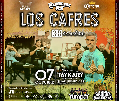 Los Cafres son unos de los exponentes más importantes del Reggae Roots en español y ahora llegaran por primera vez a Cajamarca a deleitar con sus mejores éxitos tales como: Tus ojos, Aire, Una perla en mi vida, Momento, entre otros.