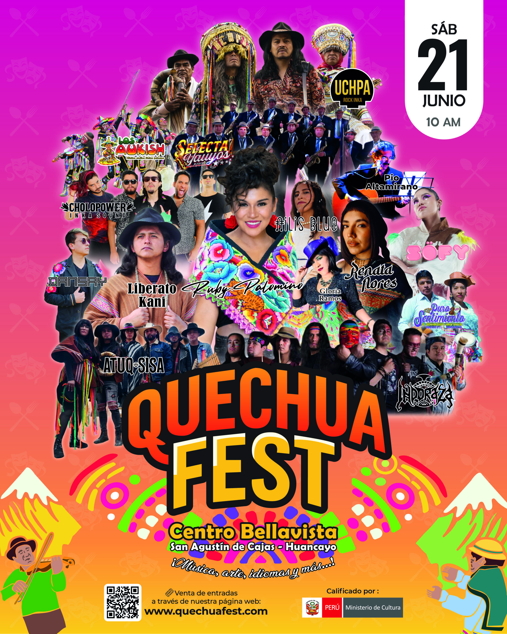 El cartel del Quechua Fest reunirá a destacados talentos nacionales como Uchpa, Liberato Kani, Renata Flores, Söfy, Atuq Sisa, Cholo Power, Selecta Yauyos, Ruby Palomino, Indoraza, Ailis Blue, Pío Altamirano, Dansay, Los Aukish y Puro Sentimiento. Además, el estudio de animación Ninakami tendrá un stand exclusivo con merchandising de sus producciones en quechua y activaciones especiales durante la jornada.