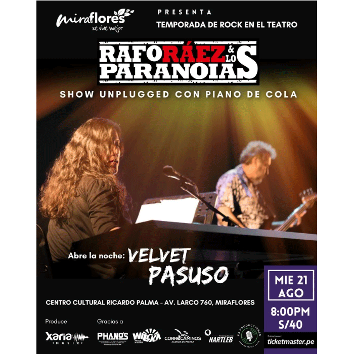 Rafo Raez & Los Paranoias Unplugged con piano de cola este 21 de agosto en el Auditorio Julio Ramón Ribeyro del C.C. Ricardo Palma en Miraflores.