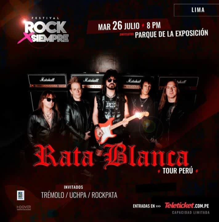 Rata Blanca llega al Perú, como parte de su gira de «El Gran Reencuentro», el martes 26 de julio, en el Anfiteatro del Parque de La Exposición de Lima desde las 8 p.m.