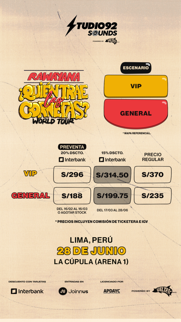 Gracias a la acogida que tienen es que este 28 de junio vuelven a Lima para brindar un show de reencuentro como parte de su gira mundial ‘¿Quién trae las Cornetas?’. La cita será en la Cúpula (Arena 1)y las entradas estarán a la venta desde este jueves 16 de febrero en la plataforma digital de Joinnus, desde las 10:00 am. Cabe resaltar que menores de edad a partir de 12 años pueden ir acompañados de un adulto responsable al show. Ambos deberán contar con su entrada.