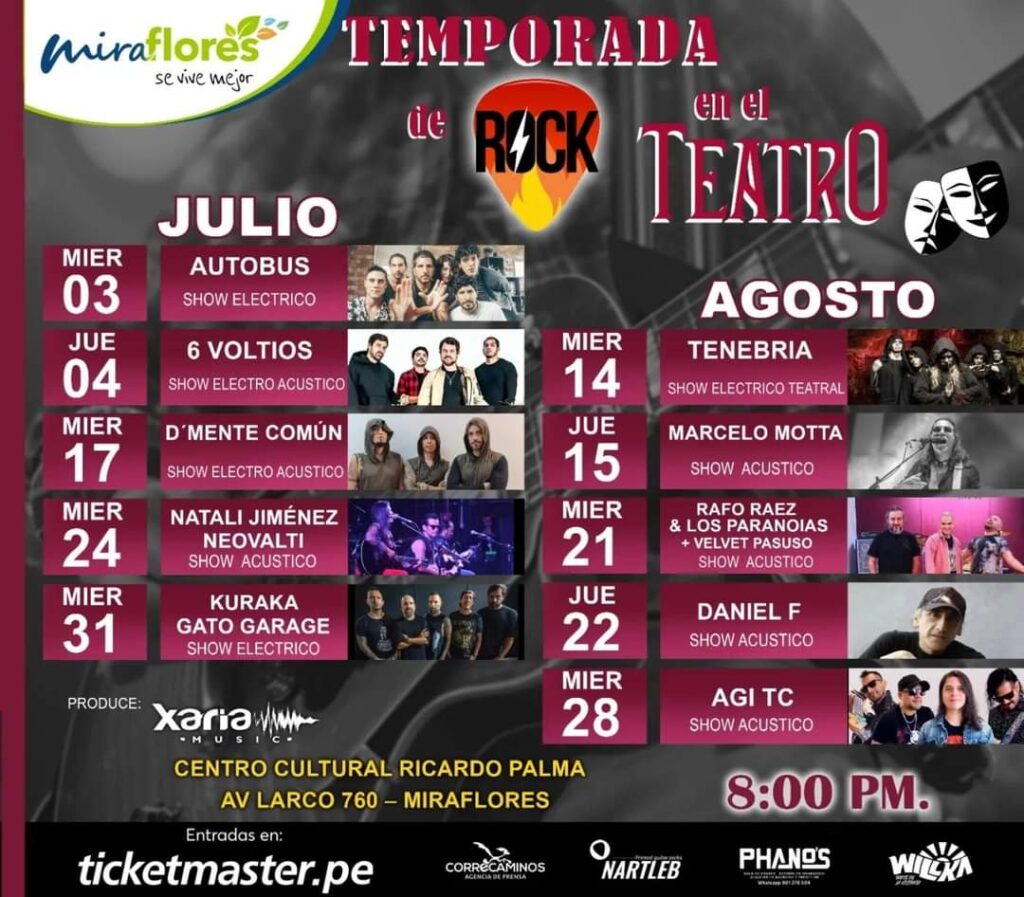 La Municipalidad de Miraflores y la productora Xaria Music presentaron oficialmente la temporada de “Rock en el teatro”, ciclo de conciertos electroacústicos con reconocidas figuras del rock nacional que se llevará a cabo en julio y agosto en el auditorio Julio Ramón Ribeyro del Centro Cultural Ricardo Palma.