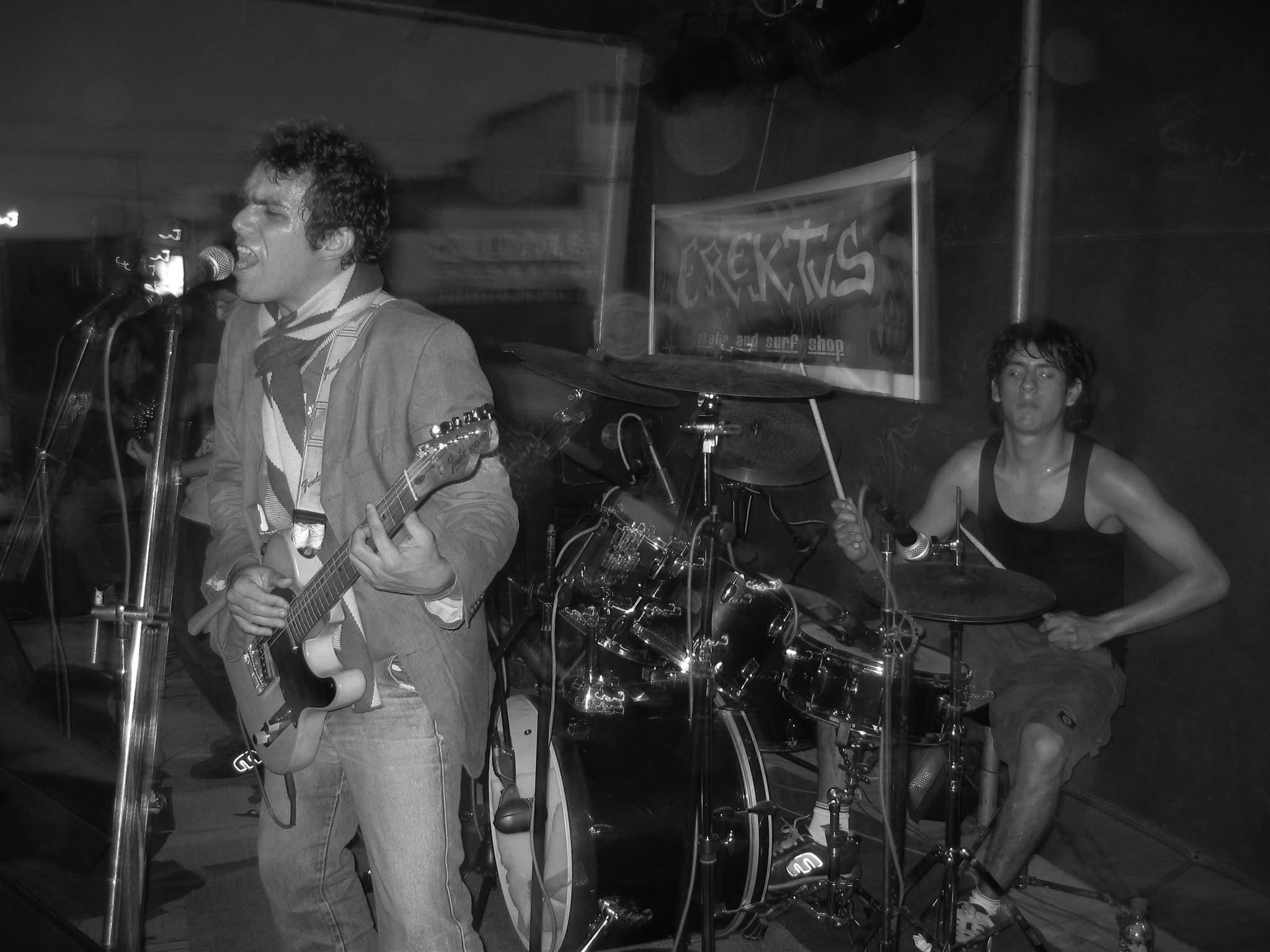 Entonces, Antonio llegó. Recuerdo que nos hicimos muy amigos de inmediato. Alucinábamos lo mismo y nos volvimos muy cercanos. En uno de los primeros ensayos con él, justamente 6 Voltios había estado tocando antes, en la misma sala. Ensayaban justo antes que nosotros. Y cuando llegó nuestro turno, […] se quedaron un rato más para escucharnos. A Alexis le gustaba una canción de La Forma que se llamaba “El Necio”. Se quedaron, y después del ensayo nos contaron que iban a tocar en un concierto autogestionado con un organizador independiente que recién estaba empezando a hacer cosas en un centro comercial en Angamos. Se llamaba Angamos Center, era una especie de estacionamiento. Nos preguntaron si queríamos tocar ahí, que podían hablar con el organizador para que nos hicieran un espacio.