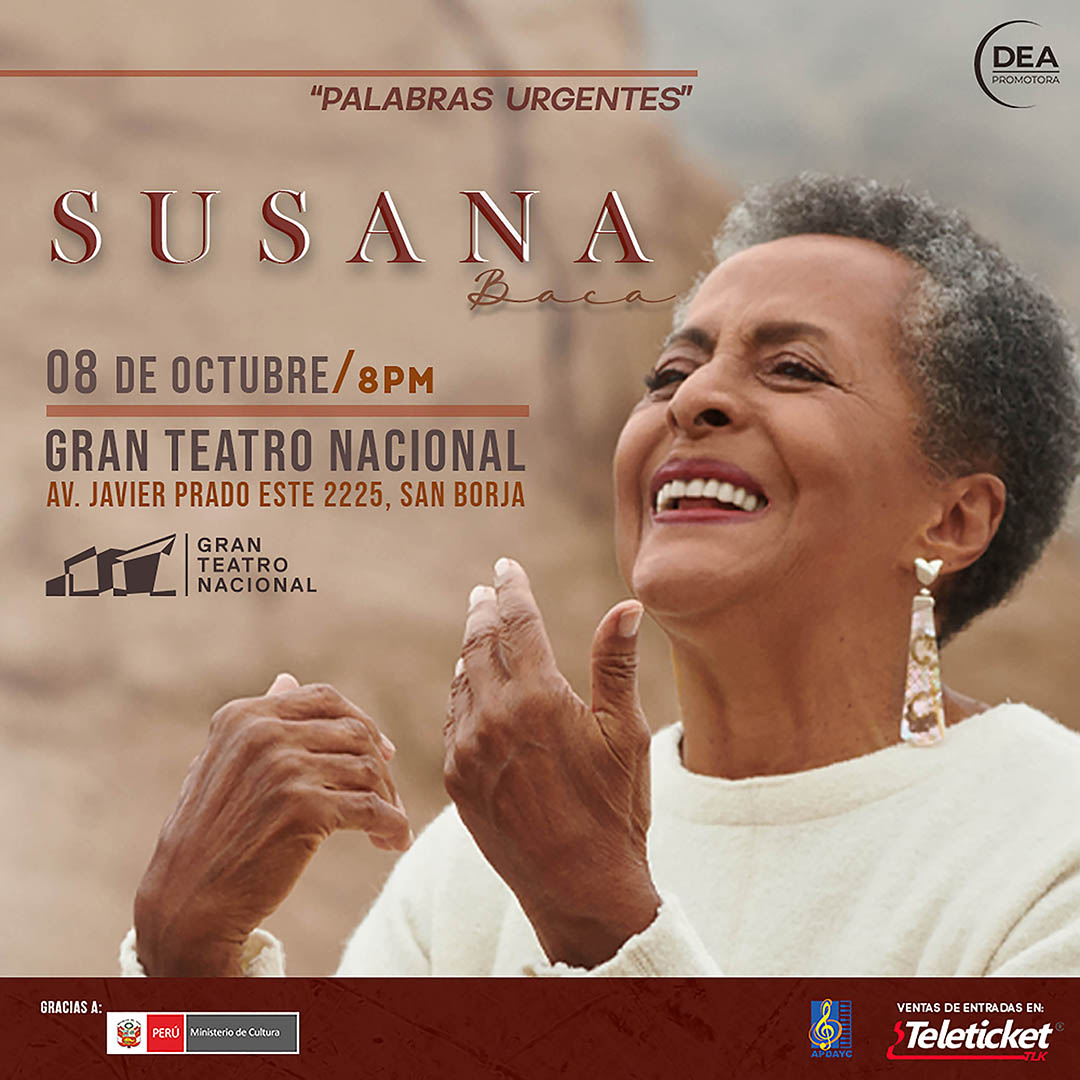 Con la alegría de poder reencontrarse con su público peruano, Susana Baca anuncia que este 8 de octubre volverá al Gran Teatro Nacional para presentar “Palabras Urgentes”, concierto con el que ya ha recorrido importantes escenarios de Europa; y, cuya gira, antes de llegar a Lima, prosigue por países como Argentina, Uruguay y Chile. Las entradas ya están a la venta en Teleticket: