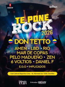 Lima se prepara para vivir una de las reuniones más importantes del rock en la región con Te Pone Rock 2026, un evento que congregará a reconocidas bandas y referentes del circuito latinoamericano en una sola jornada. El festival se realizará el sábado 17 de enero de 2026 en el Club Cultural Deportivo Lima, ubicado en Av. Alameda Sur 1530, Chorrillos.