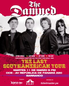 La cita en Lima – Perú será el martes 11 de marzo en el Centro de Convenciones Barranco (Av. Republica de Panamá 220 Barranco), un espectáculo que incluirá varios de los clásicos de sus primeros discos, como «Damned Damned Damned» (1977), «Machine Gun Etiquette» (1979) y «The Black Album» (1980), sin descuidar su material más reciente («Darkadelic», 2023).