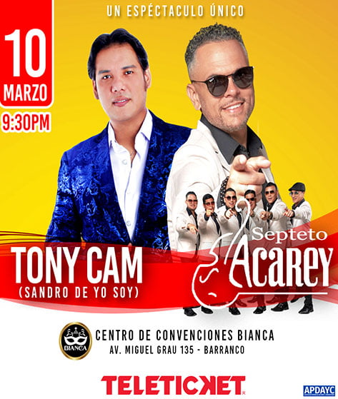 Tony Cam, el popular  Sandro de “Yo soy”, y la reconocida agrupación peruano – cubana Septeto Acarey compartirán por primera vez el escenario del Centro de Convenciones Bianca de Barranco. Este exclusivo concierto para románticos y salseros ofrecerá música en vivo y lo mejor de sus respectivos repertorios. Las entradas están a la venta en Teleticket.