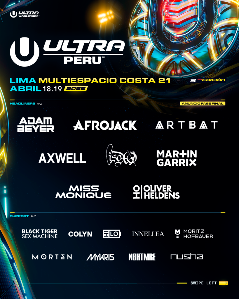 ULTRA Peru 2025 será un evento como parte de la celebración global por los 25 años de ULTRA Miami. Con una expansión sin precedentes en Multiespacio Costa 21, el festival presentará tres escenarios: el MAIN STAGE, donde artistas como Axwell, Martin Garrix, Afrojack y Oliver Heldens harán vibrar a miles de asistentes; RESISTANCE, con íconos del techno y house como Adam Beyer, ARTBAT y HI-LO; y un tercer escenario que reunirá talento emergente y sorpresas especiales. Además, la nueva distribución del venue ofrecerá zonas exclusivas y espacios renovados para una experiencia inmersiva.